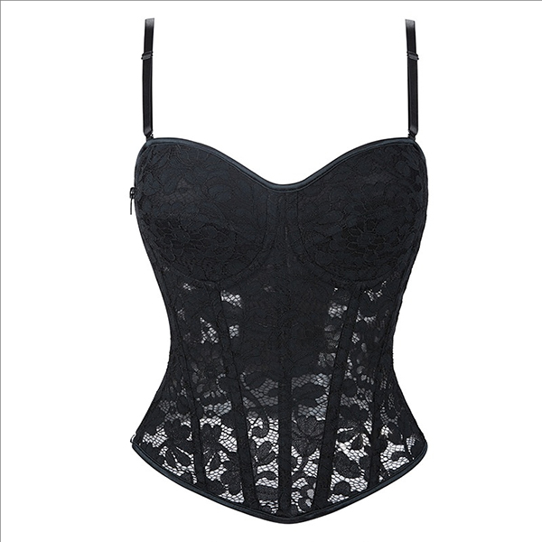 Embrace the "lingerie as outerwear" trend with this stunning black lace bustier. Designed to turn heads, this corset top perfectly blends romantic delicacy with an edgy, night-out vibe. Whether you're hitting the club or going on a dinner date, this top guarantees a memorable entrance.