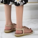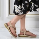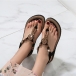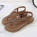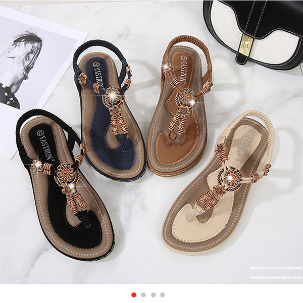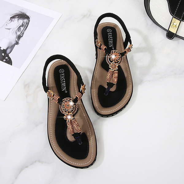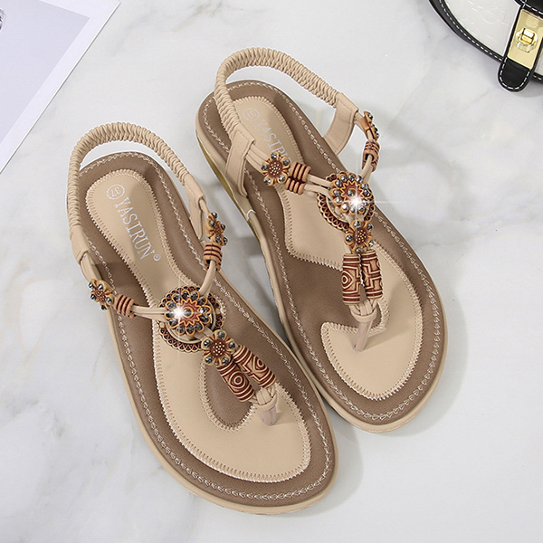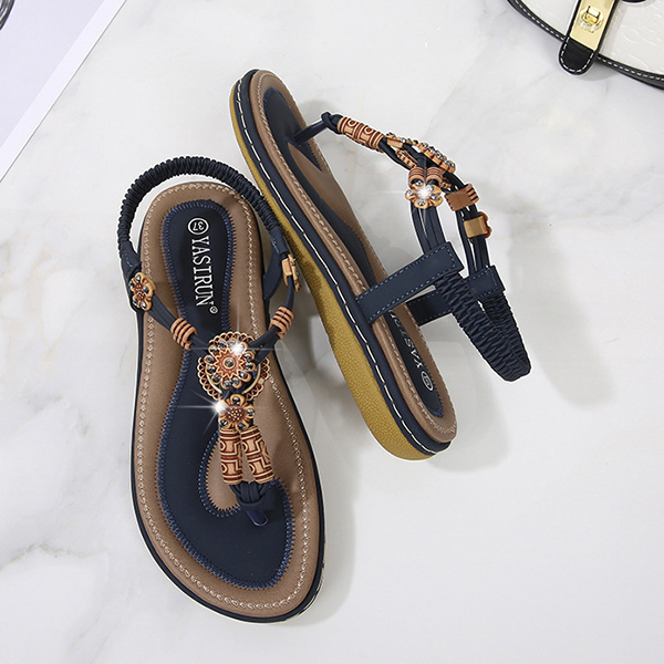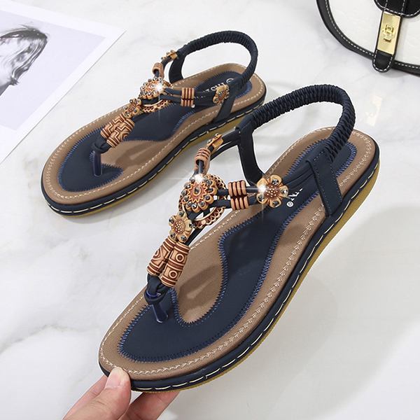 Women's Boho Beaded Flat Sandals - Comfortable Floral T-Strap Summer Beach Shoes with Elastic Ankle Strap