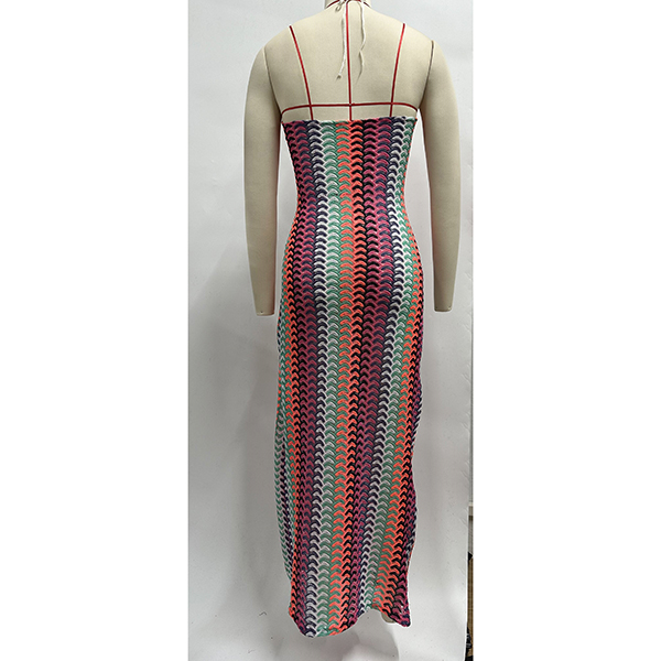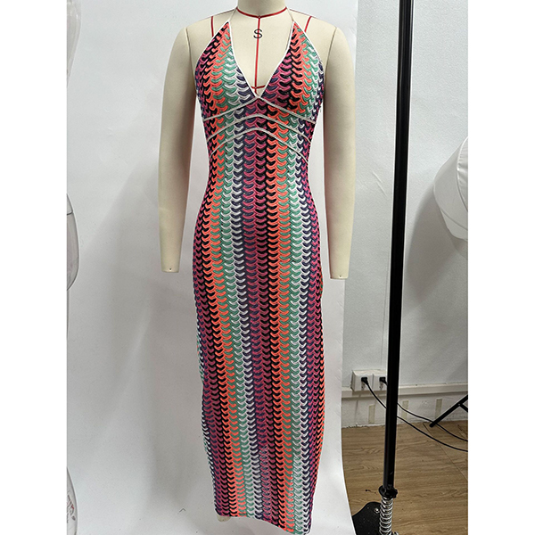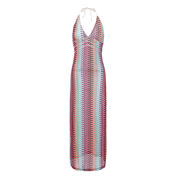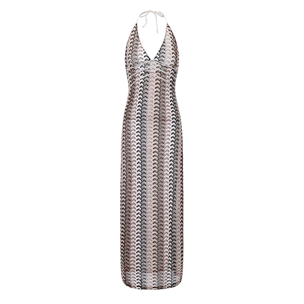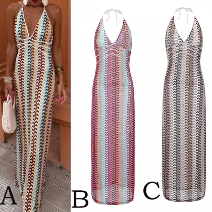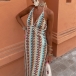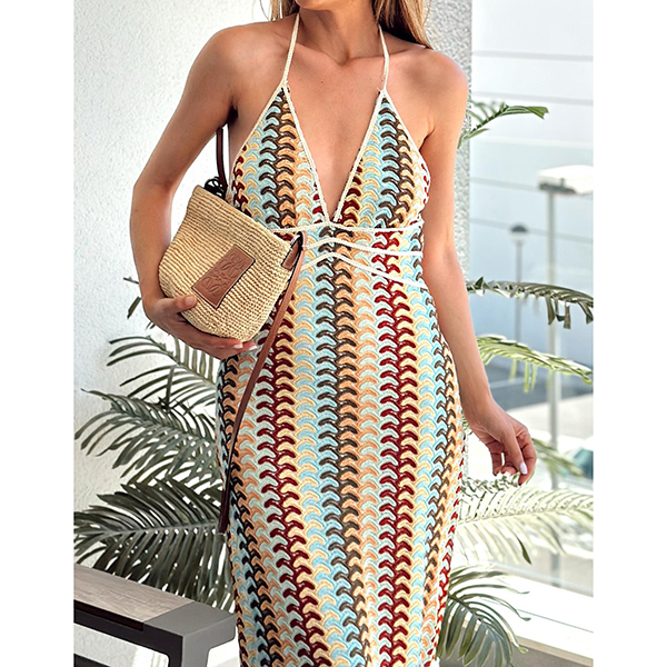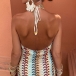 Women's Boho Knit Halter Midi Dress Wave Pattern Crochet Backless Summer Beach Vacation Dress