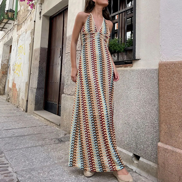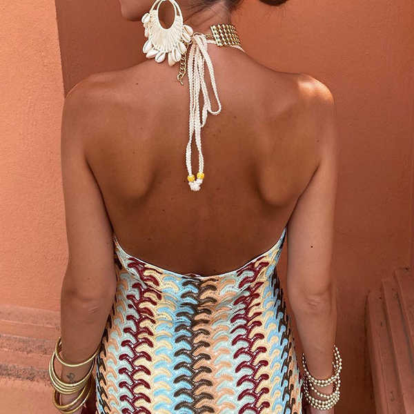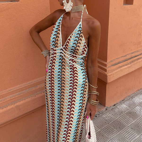 Turn heads on your next getaway with the this Knit Halter Dress. Crafted from a beautifully textured, crochet-inspired knit, this dress features a striking vertical wave pattern designed to elongate and flatter your silhouette. The sultry plunging V-neckline is supported by a classic halter tie, leading to a stunning open back. Whether you're sipping cocktails by the pool or heading to a sunset dinner, this bohemian midi dress is your ultimate vacation staple. Available in three captivating colorways.