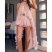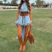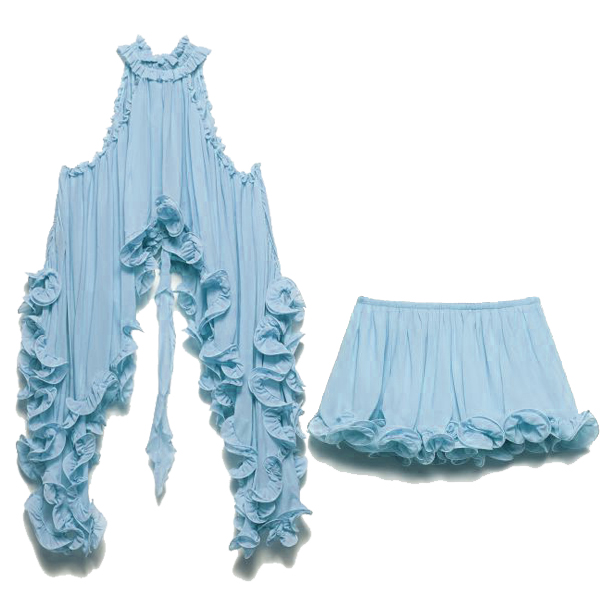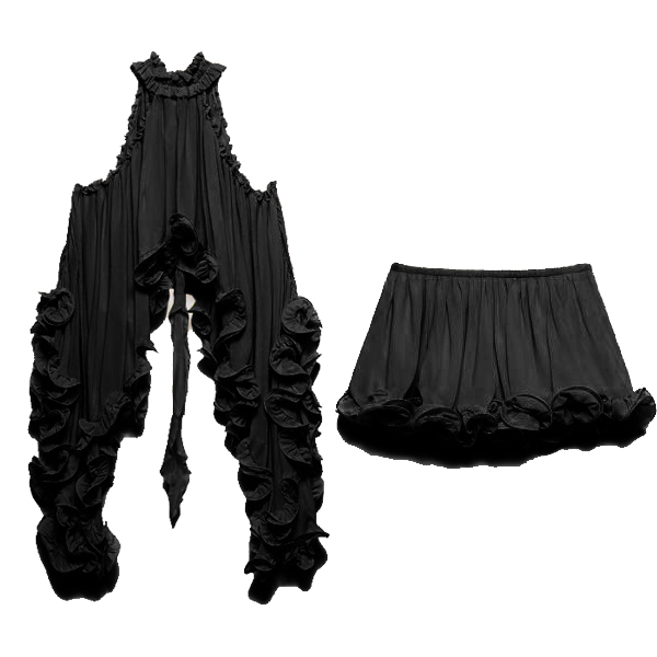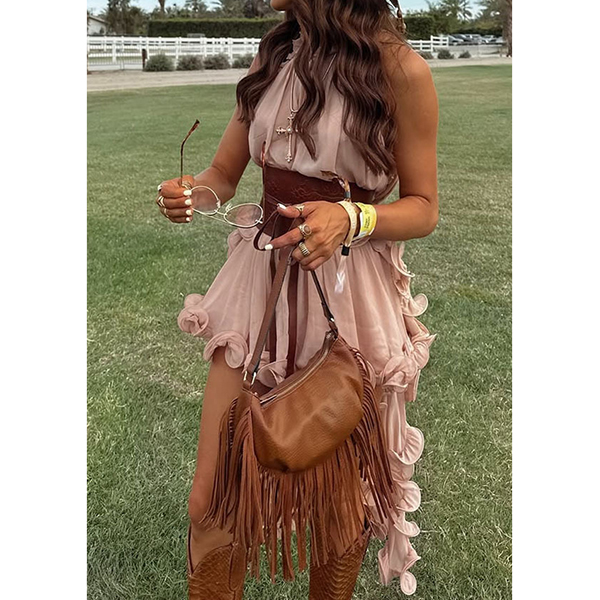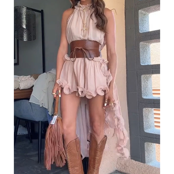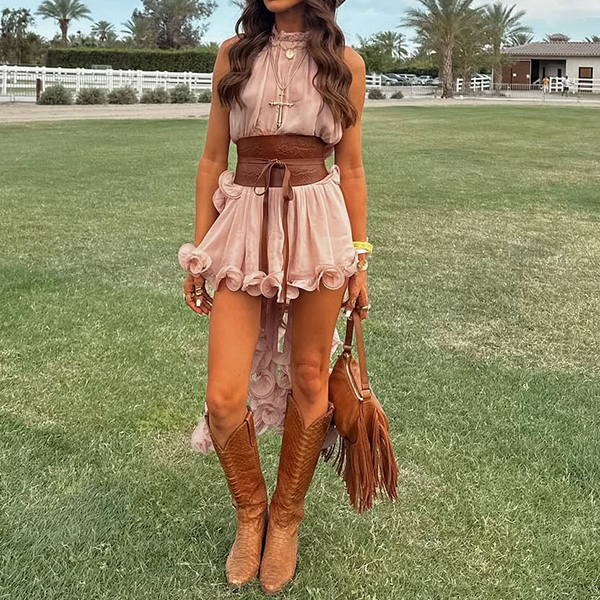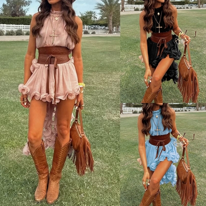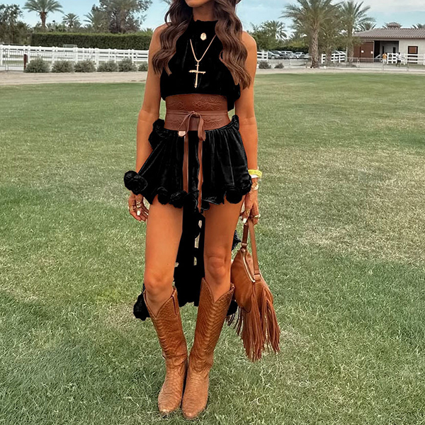 Embrace your free spirit with our breathtaking Prairie Wind Ruffle Set. Designed for the bohemian at heart, this two-piece ensemble features a sleeveless, high-neck top with a dramatic, irregular high-low hemline that flows effortlessly as you walk. Paired with matching tiered ruffle skir, the lightweight, breezy fabric creates a romantic, cascading silhouette. Perfect for summer music festivals, beach getaways, or country concerts.