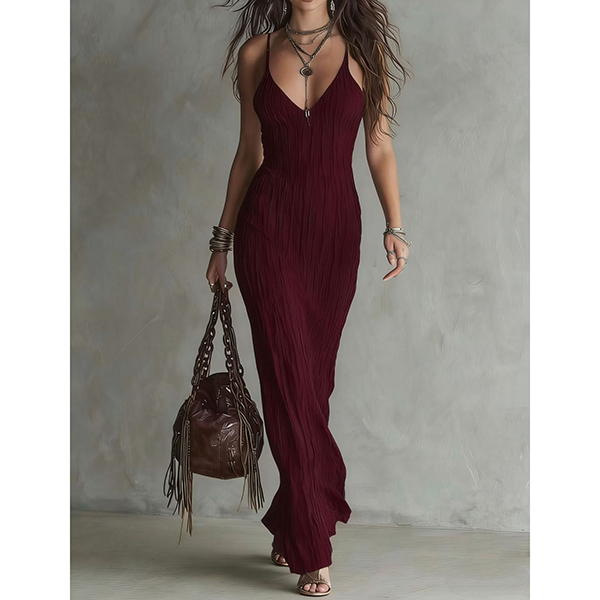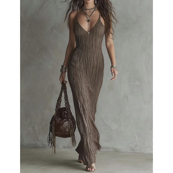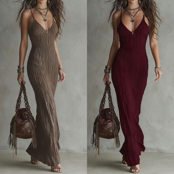 Embrace effortless bohemian elegance with this stunning textured midi dress. Crafted from a unique, lightweight crinkle fabric, this dress offers a beautiful, body-skimming silhouette that flatters your natural curves while remaining incredibly comfortable. The delicate spaghetti straps and deep V-neckline create a feminine focal point, perfect for showcasing your favorite layered jewelry. Whether you're strolling through a coastal town, attending a summer festival, or packing for a resort getaway, this earthy, travel-friendly dress is a must-have for your warm-weather wardrobe.