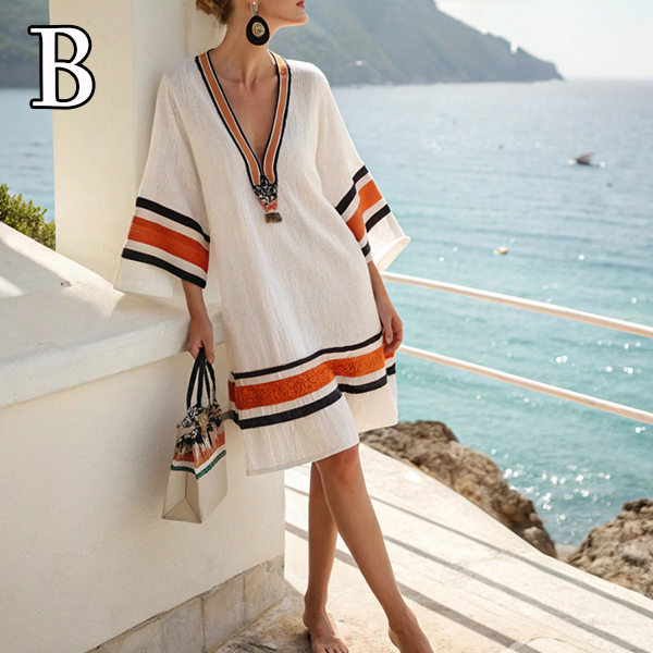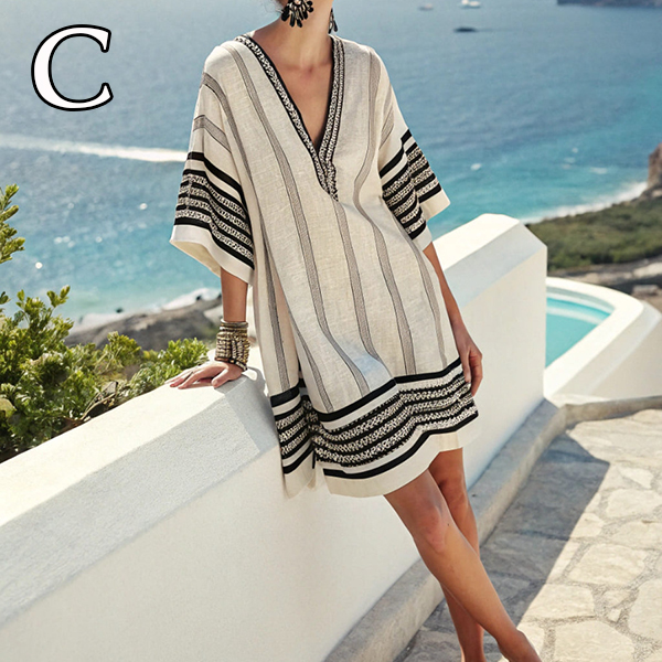 Transport yourself to the Mediterranean coast with a dress designed for sun-drenched days and balmy evenings. The shift-style tunic silhouette drapes beautifully over the body, offering a forgiving and incredibly comfortable fit that keeps you cool when the temperatures rise.