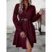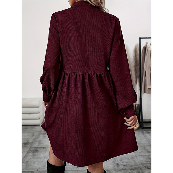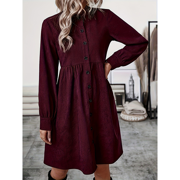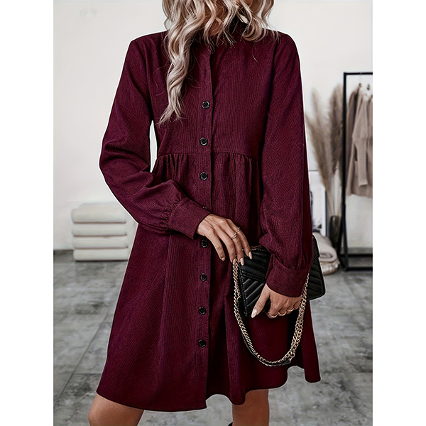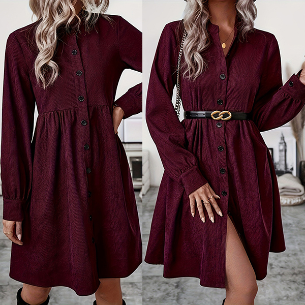 Women's Burgundy Corduroy Shirt Dress - Vintage Stand Collar Button Down Long Sleeve A-Line Dress