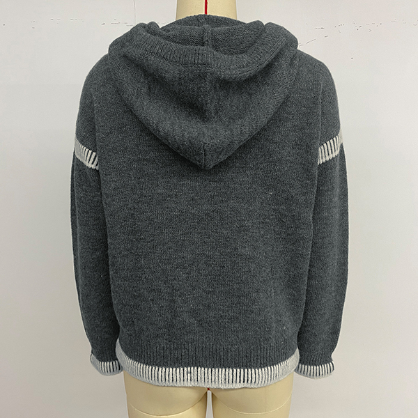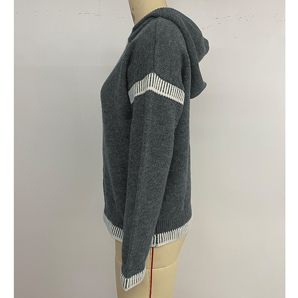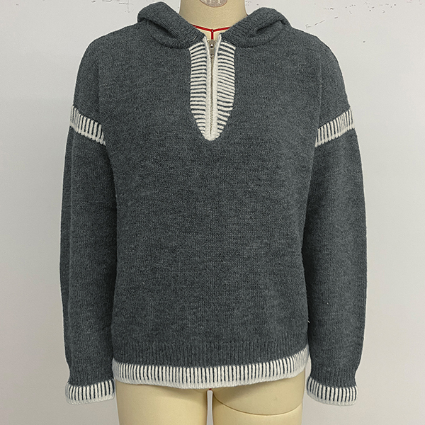 This is a stylish and versatile sweater that offers a modern twist on a classic silhouette. The half-zipper V-neck design adds a contemporary and sporty touch to the sweater, allowing you to adjust the neckline and style of the garment. The hooded feature provides a casual and laid-back vibe, offering a cozy and comfortable feel. The contrasting trim detailing adds a pop of color and visual interest to the sweater, creating a dynamic and eye-catching look. Sweaters are a versatile and essential wardrobe staple that can be styled in various ways. Pair this sweater with jeans and sneakers for a sporty and relaxed look, or dress it up with trousers and ankle boots for a more polished and put-together ensemble.