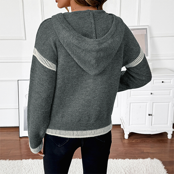 Women's Casual Half-zipper V-Neck Hooded Sweater with Contrasting Trim