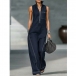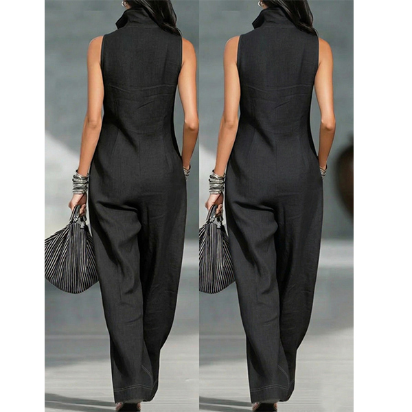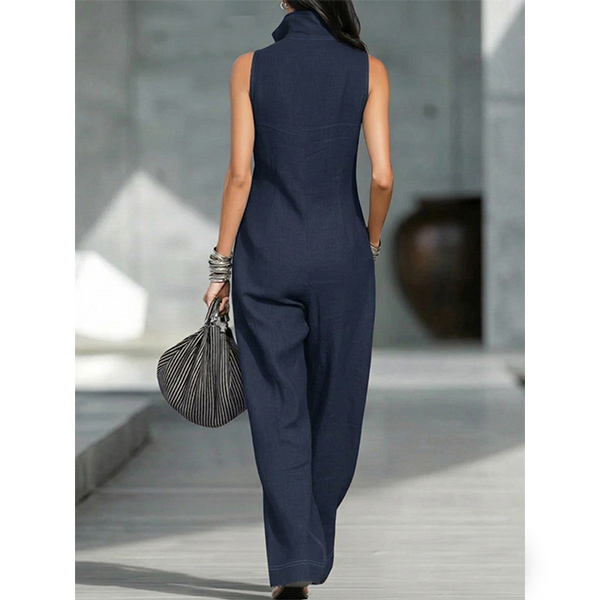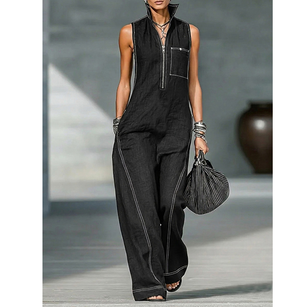 Women's Casual Sleeveless Wide Leg Jumpsuit - Half Zip Romper with Pockets