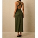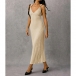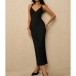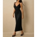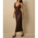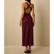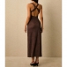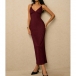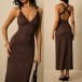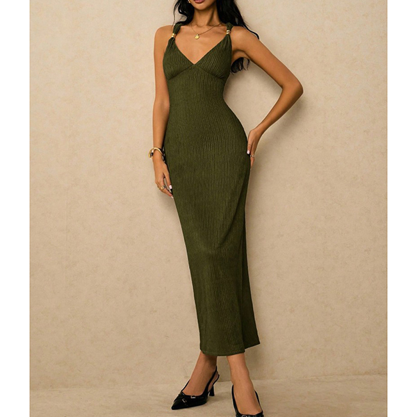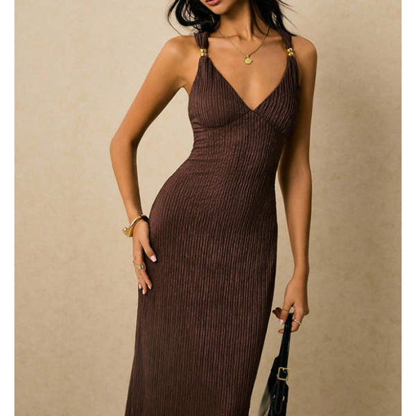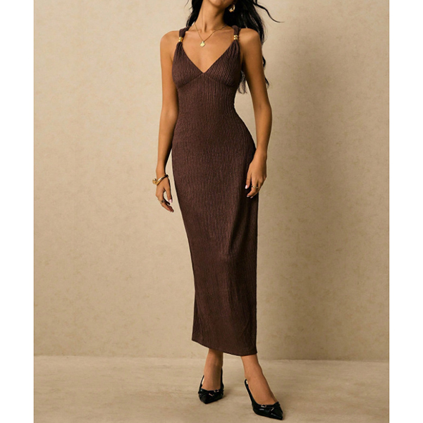 Turn heads from every angle in a dress that perfectly balances timeless sophistication with modern allure. The flattering plunging V-neckline is suspended by elegant metallic ring accents at the shoulders, adding a touch of refined glamour before you even add jewelry.The dramatic open back features a beautifully twisted criss-cross strap design that is both secure and undeniably sexy. Crafted from a luxurious textured fabric, this midi dress is your ultimate choice for wedding guest attire, upscale resort dinners, and elegant evening events.