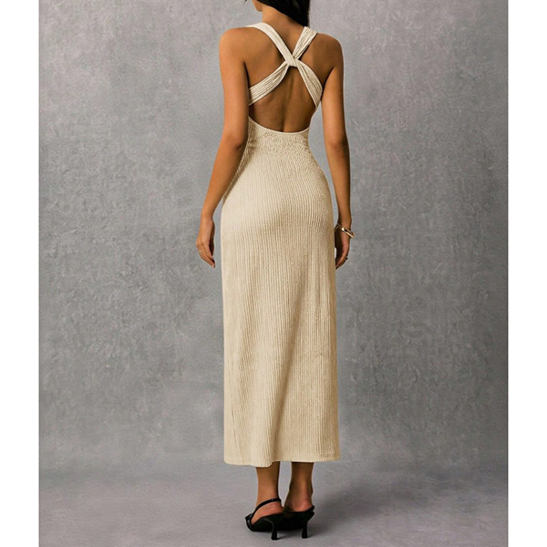 Women's Elegant Plisse V-Neck Sleeveless Criss-Cross Backless Textured Bodycon Dress