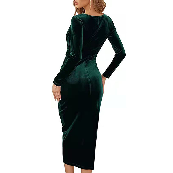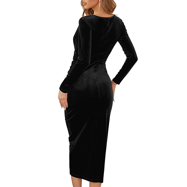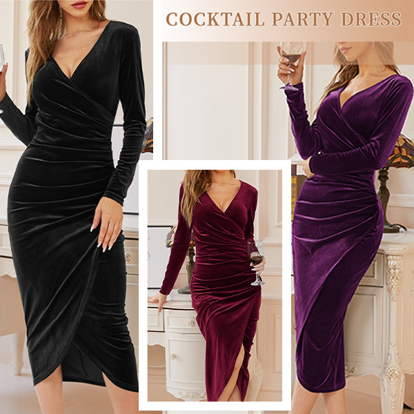 【Features】: Elegant velvet, wrap v neck, long sleeve, ruch bodycon dress that hide belly fat, slit in leg, maxi dress.