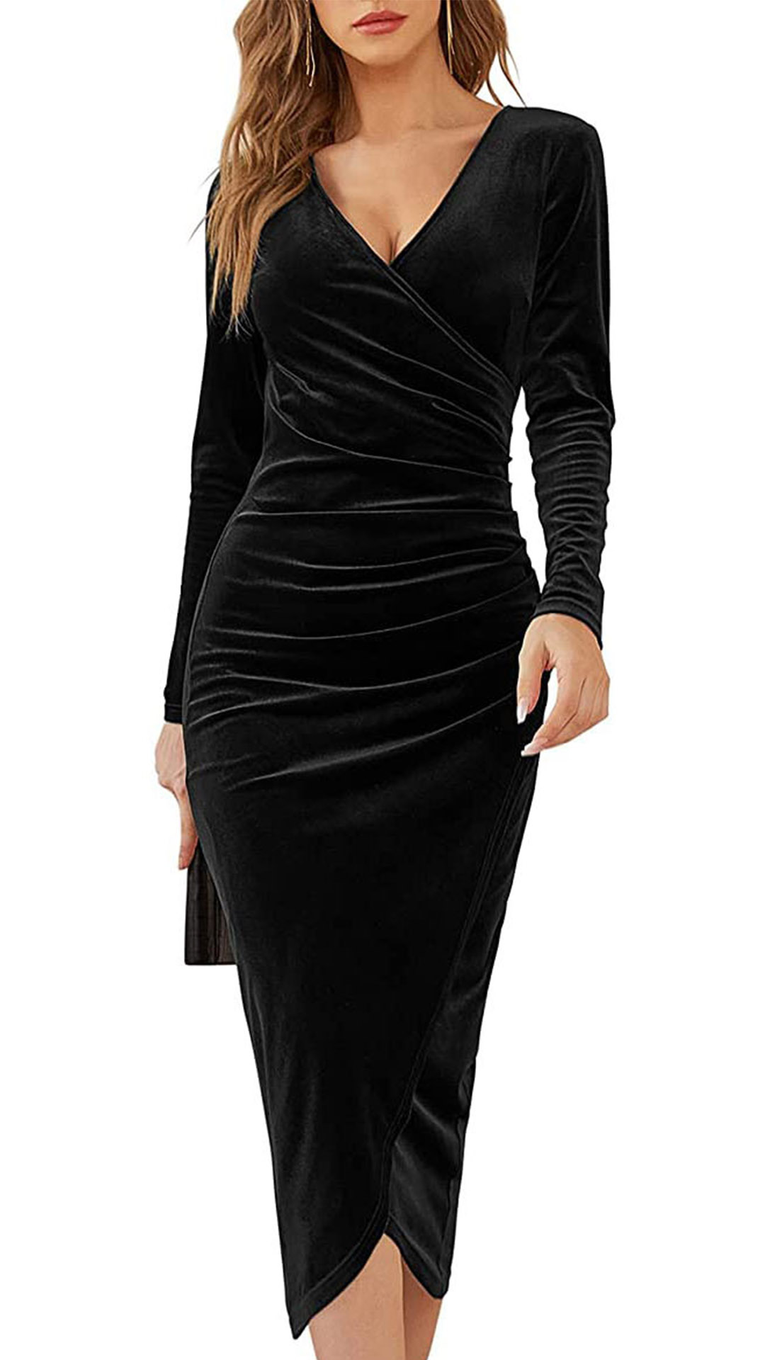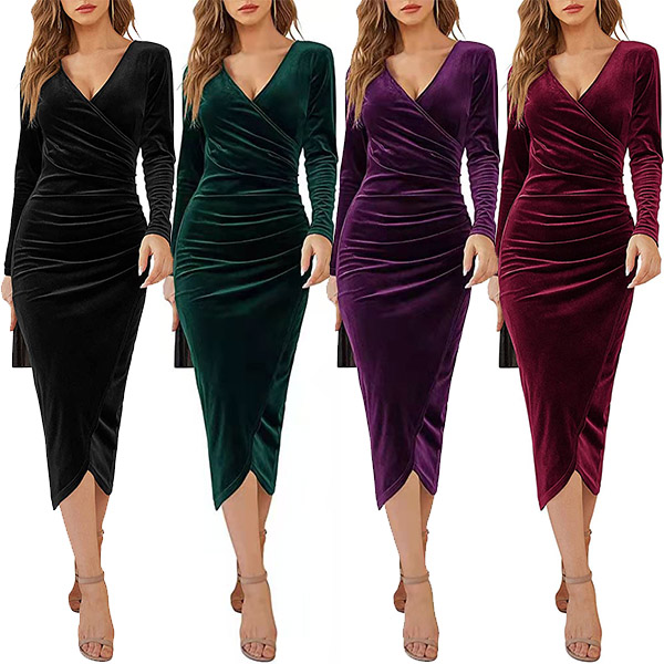 Women's Elegant Velvet Long Sleeve Wrap V Neck Ruched Bodycon Cocktail Party Sheath Dress