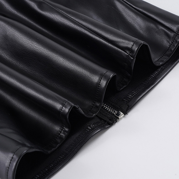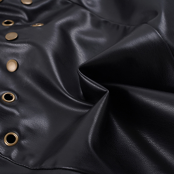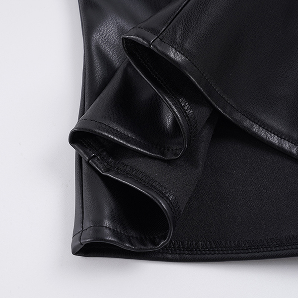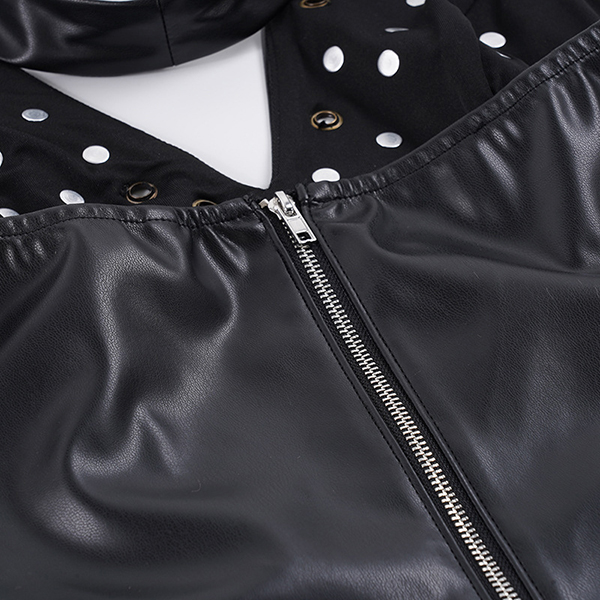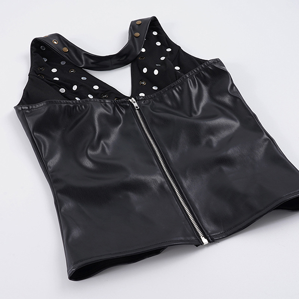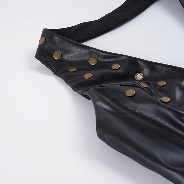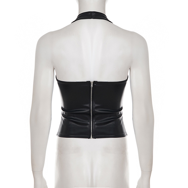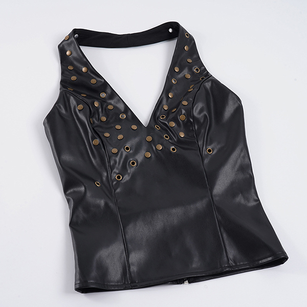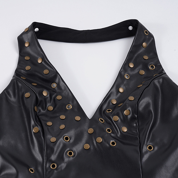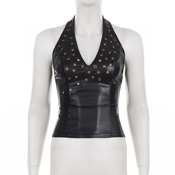 Make a bold statement with this edgy faux leather halter top. Designed for the fearless fashion lover, this piece features a flattering deep V-neckline and a sleek, form-fitting bodice that hugs your curves perfectly. The standout feature is the scattered metallic rivet detailing across the chest, adding a touch of rock-and-roll glamour to any outfit. Finished with a daring backless design and a secure back zipper, this top is your ultimate go-to for concerts, festivals, or a night out on the town.