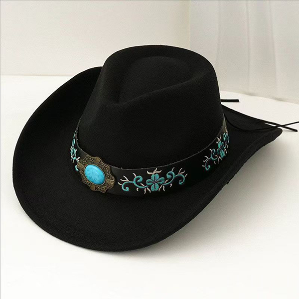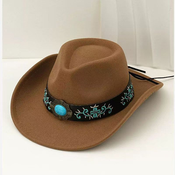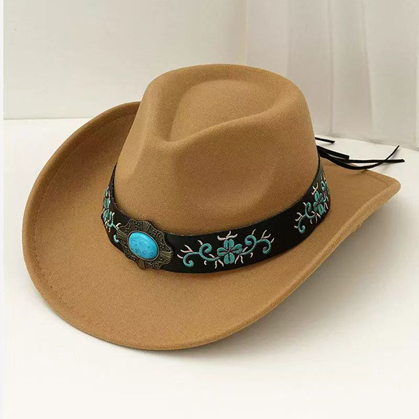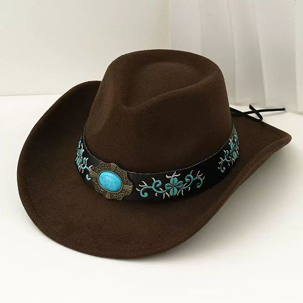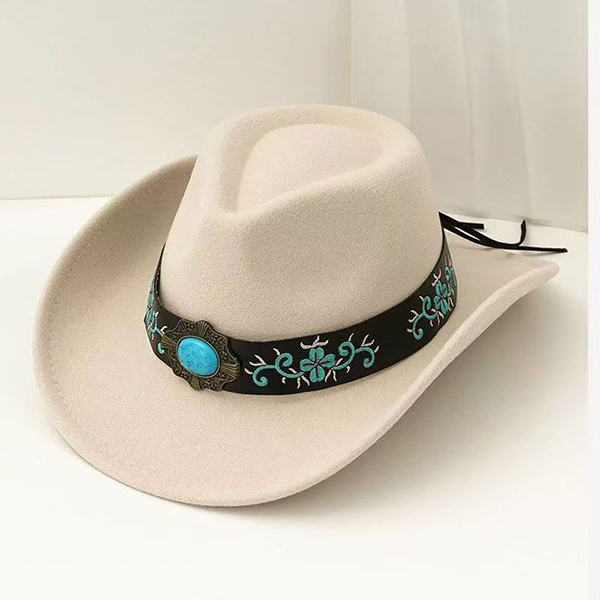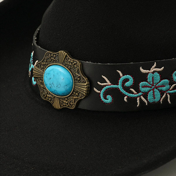 Women's Felt Western Cowgirl Hat with Floral Embroidery & Turquoise Stone Concho Band