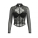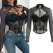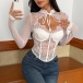 Women's Floral Lace Corset Top with Sheer Mesh Sleeves and Keyhole Tie