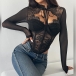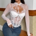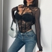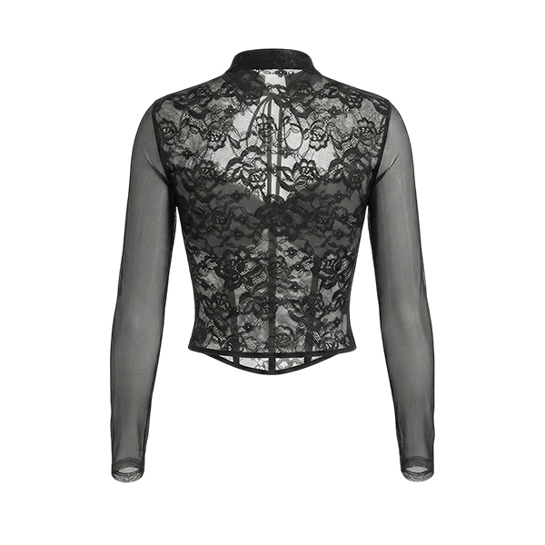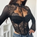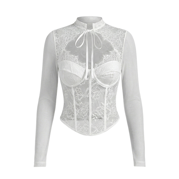 This sophisticated top features romantic floral lace styling with structured corset construction and delicate sheer mesh sleeves for contemporary feminine elegance. And the keyhole tie detail offers charming focal point and adjustable refinement. Perfect for romantic occasions, sophisticated styling, or contemporary feminine coordination.