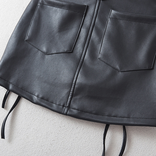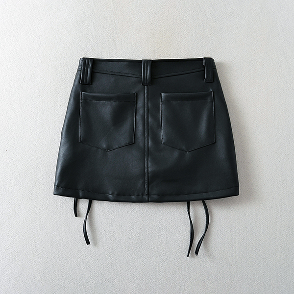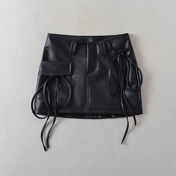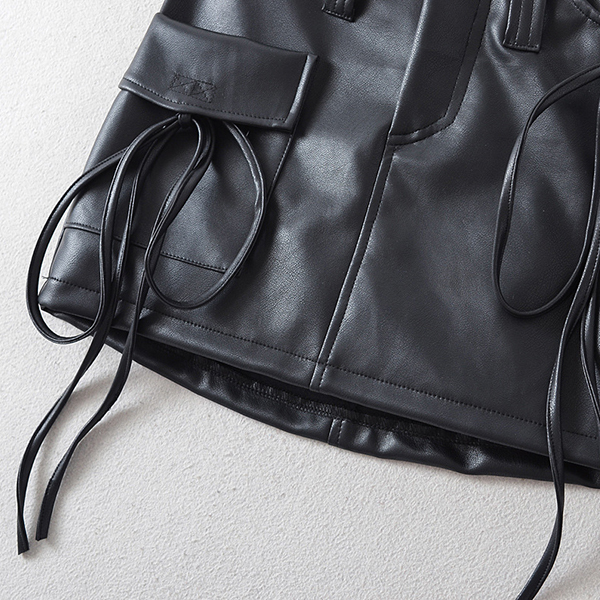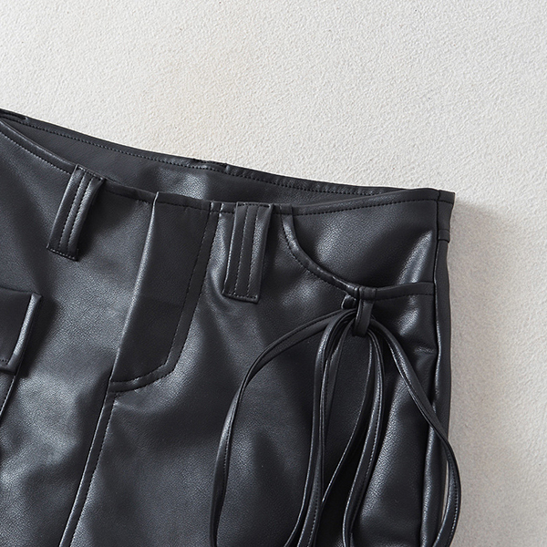 This edgy skirt features modern low-rise styling with luxurious faux leather construction and utilitarian cargo design for contemporary bold sophistication. The cargo detailing provides functional style with urban charm whilst the strappy tie elements offer adjustable accents and dynamic visual interest. Pair with fitted tops and edgy accessories for sophisticated contemporary appeal.