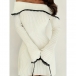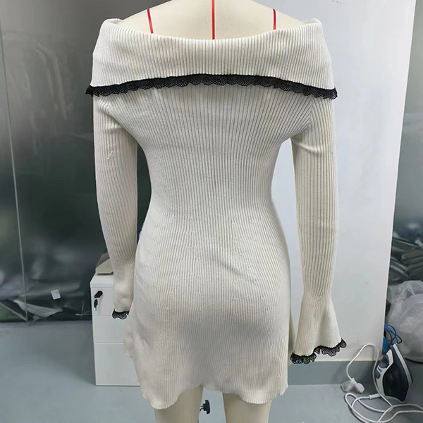 Women’s Off-the-Shoulder Ribbed Knit Sweater Dress - Contrast Lace Trim Fold-Over Neck Long Flared Sleeve Bodycon Mini