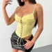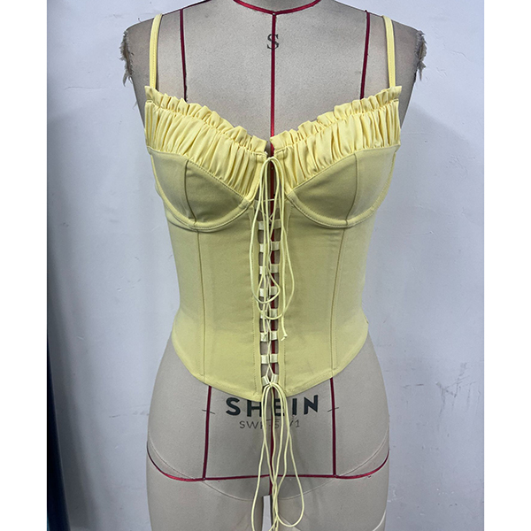 Bring a splash of sunshine to your wardrobe with this Corset Top. The romantic ruffled sweetheart neckline and gathered bust cups beautifully frame your décolletage, while the eye-catching front lace-up detail adds a playful, vintage-inspired edge. Designed with structured boning to cinch your waist and delicate spaghetti straps for a barely-there feel, this bustier creates a flawless, figure-hugging silhouette. Perfect for sun-drenched picnics or warm summer nights out.