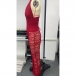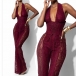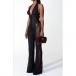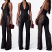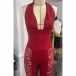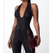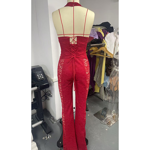 This sexy jumpsuit features confident halter styling with structured corset waist construction and elegant sheer floral lace detailing for contemporary dramatic sophistication. Perfect for sophisticated occasions, statement styling, or contemporary dramatic coordination.