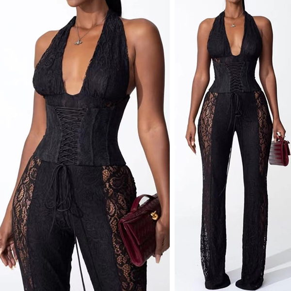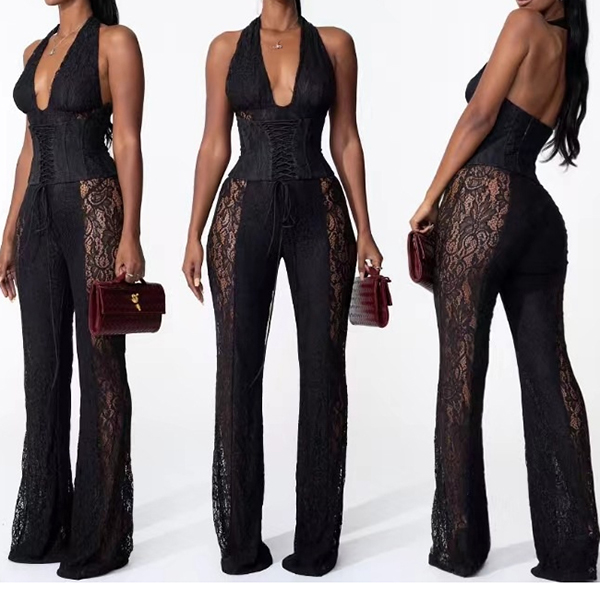 Women's Sexy Halter Jumpsuit - Corset Waist with Lace-Up Detail & Sheer Floral Lace Side Panels