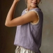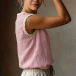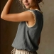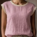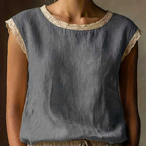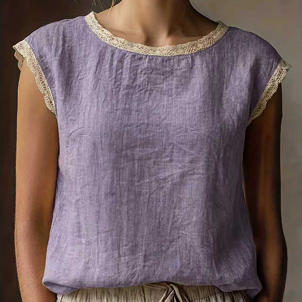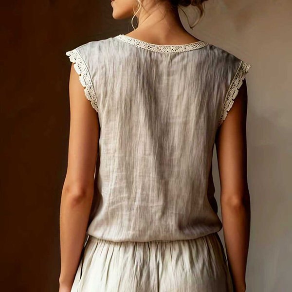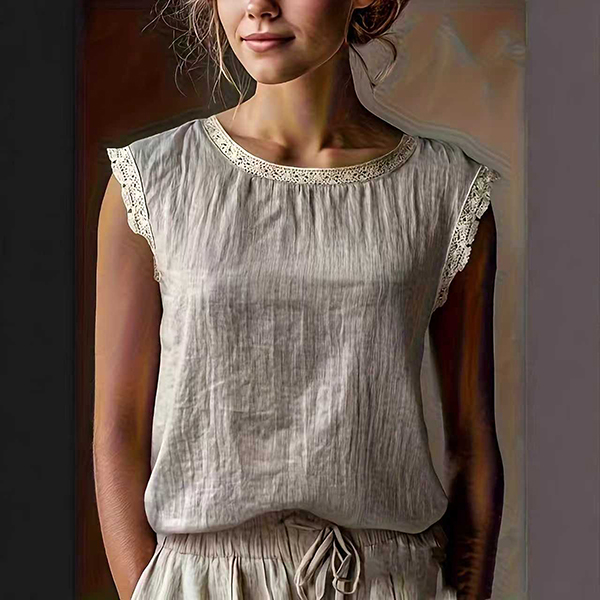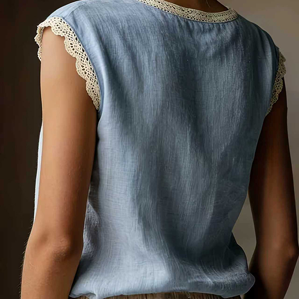 Embrace the warmth of the season with this beautifully textured sleeveless top. Crafted from a breathable, crinkled fabric, this blouse is designed to keep you cool and comfortable all day long. The standout detail is the delicate crochet lace splicing along the round neckline and armholes, adding a touch of vintage romance and bohemian flair to a classic silhouette. Its relaxed fit drapes softly over the body, making it perfect for casual outings, beach vacations, or lounging at home.