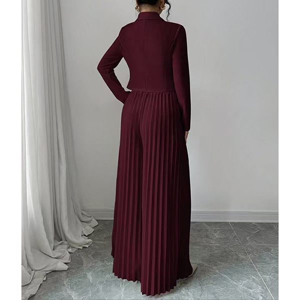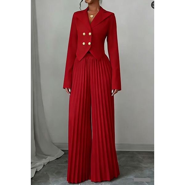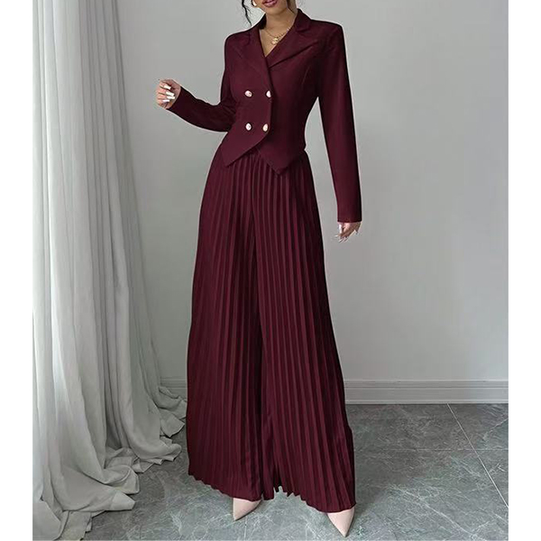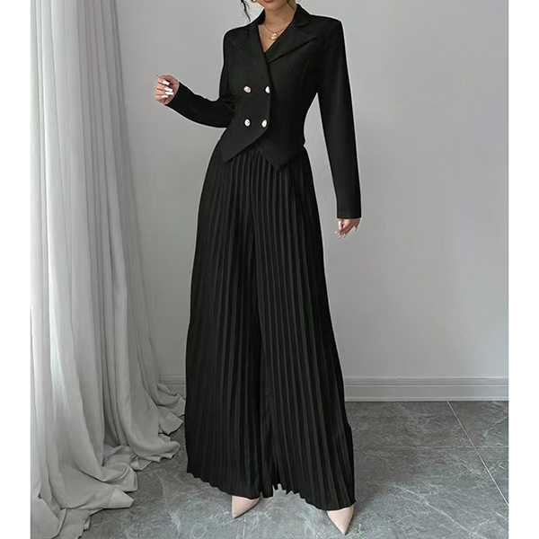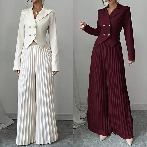 This suit set features coordinated professional styling with structured double-breasted crop blazer and elegant pleated wide-leg pants for contemporary business elegance. Perfect for professional occasions, business styling, or sophisticated formal coordination.