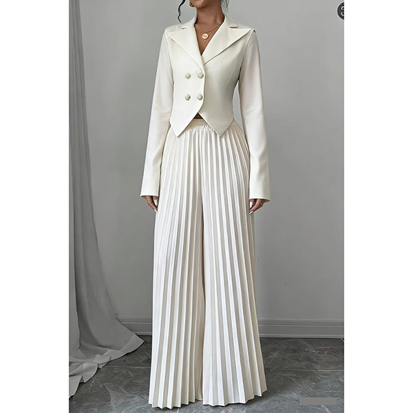 Women's Two-piece Suit Set Consist of Double-breasted Crop Blazer and Pleated Wide-leg Pants