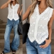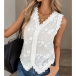 Women's V-Neck Sleeveless Button-Down White Floral Embroidered Lace Vest Top