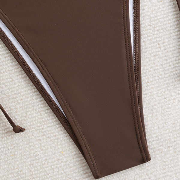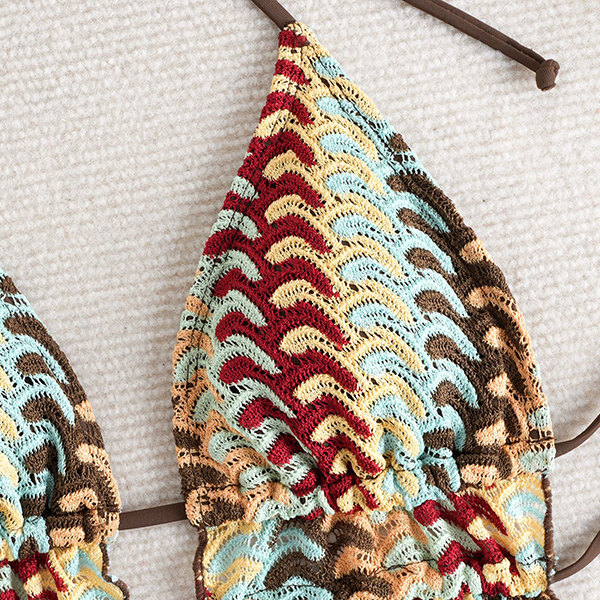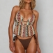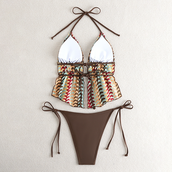 This unique two-piece swimsuit is a masterclass in bohemian style, featuring a striking halter top crafted with a textured, earthy-toned chevron pattern. The top is designed with a plunging V-neckline and a flattering split peplum hem that adds a touch of playful movement to your beachside look. Paired with classic, solid chocolate-brown tie-side bottoms, this set offers a fully adjustable fit that hugs your curves perfectly. Whether you're lounging at a desert resort or soaking up the sun on a tropical coast, this swimsuit guarantees a standout silhouette.