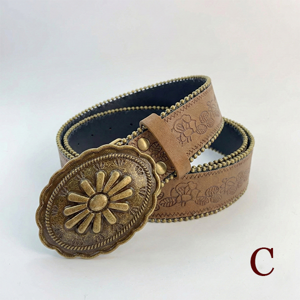 Women's Western Floral Embossed Faux Leather Belt - Y2K Boho Large Metal Buckle Waistband for Jeans/Skirt/Dress