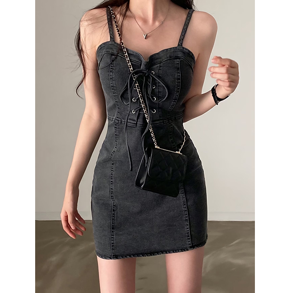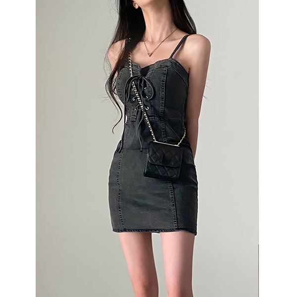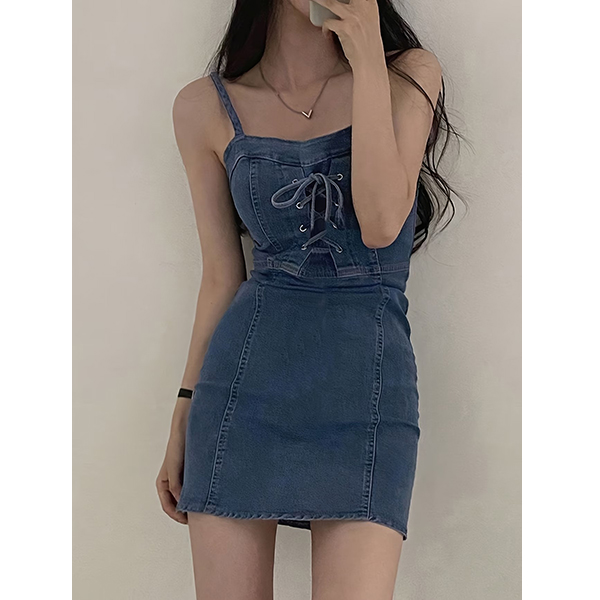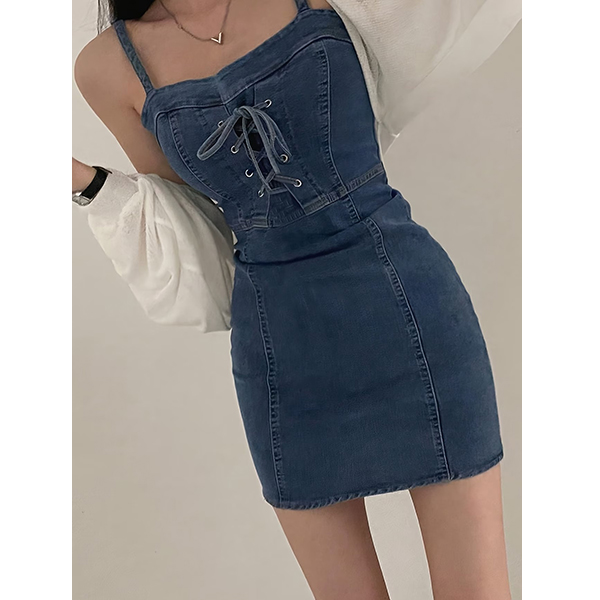 Channel ultimate Y2K vibes with this Lace-Up Denim Mini Dress. This figure-hugging piece combines the classic appeal of denim with trendy, corset-inspired details. Featuring delicate spaghetti straps and a flattering square neckline, the standout feature is the adjustable lace-up front that adds a touch of edge to your look. The structured vertical panel seams are designed to contour and flatter your silhouette, creating a perfect bodycon fit. Whether you're dressing it up for a night out or keeping it casual for a weekend stroll, this mini dress is a certified wardrobe staple.